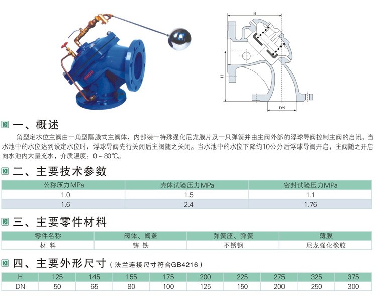 角型定水位閥,是一種隔膜式調節水箱和水塔液面高度的閥門。閥門由一特殊強化尼龍膜片將其分為上下兩個腔室,當液面達到設定位置時,浮球導閥關閉,上腔壓力大于下腔,閥門關閉,即停止供水.當液面下降超過預設位置,浮球導閥開啟,上腔壓力小于下腔壓力,閥門開啟.閥門向池內供水。角型定水位閥安裝方便,可省去管道彎頭,節省安裝空間。該閥保養簡單、靈活耐用、液位控制準確度高,水位不受水壓干擾且關閉緊密不漏水,性能可靠、成本低。浮球可隨水池的高度和距離安裝。